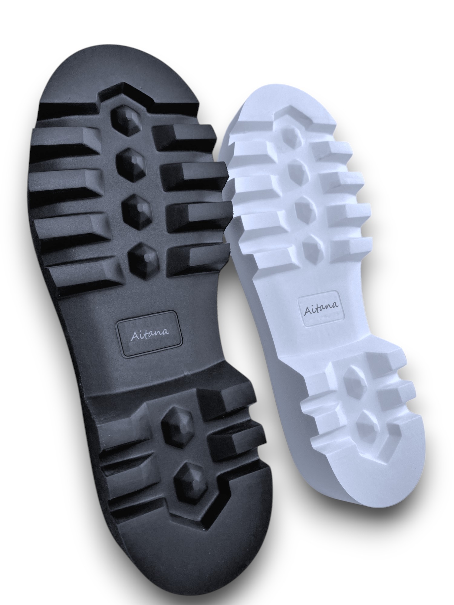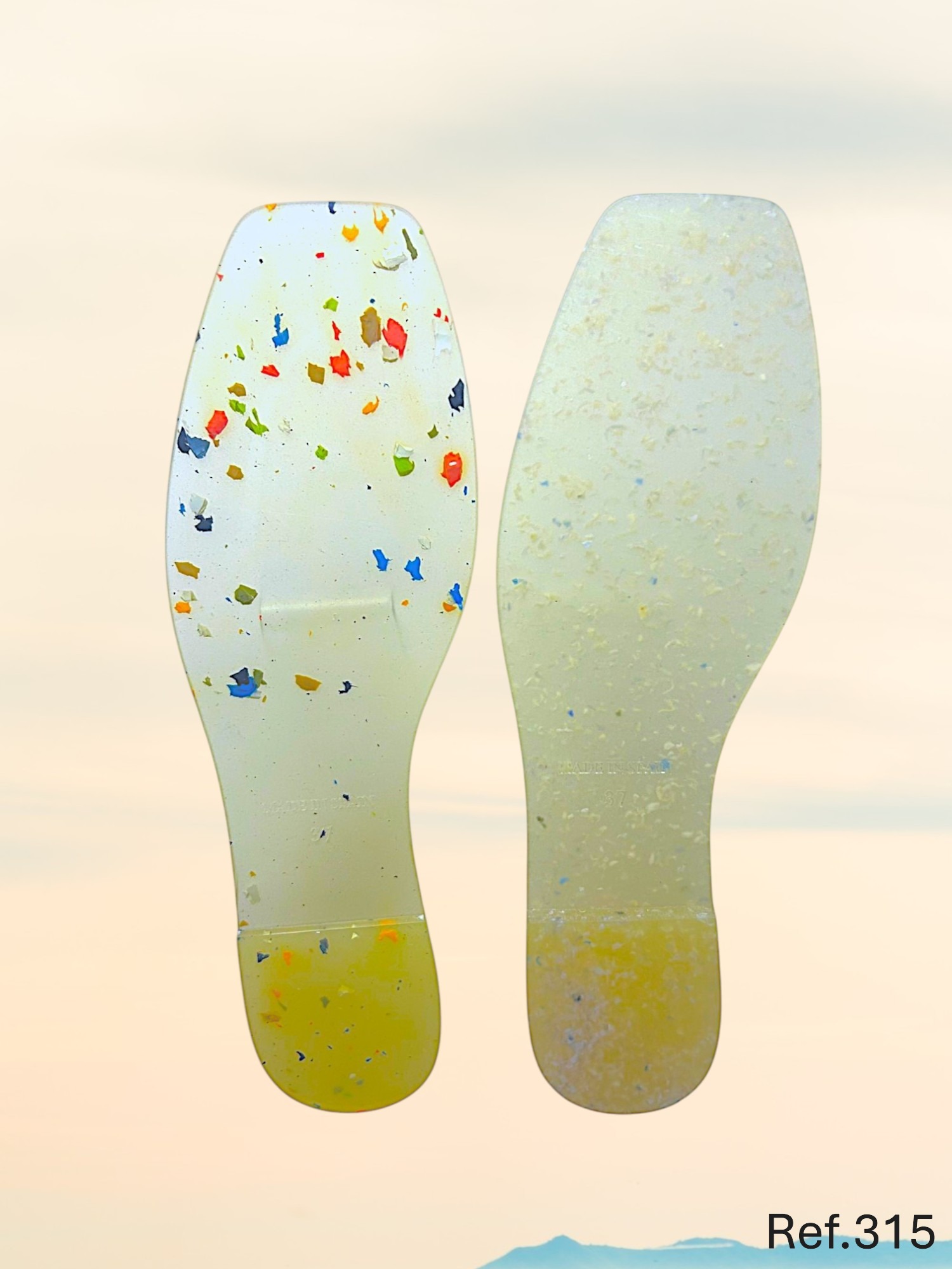 Sostenibles e innovadoras suelas de crepelina y TPU recicladas con diferentes productos como el PET, el caucho, polvo de cuero, algas marinas, cafe…